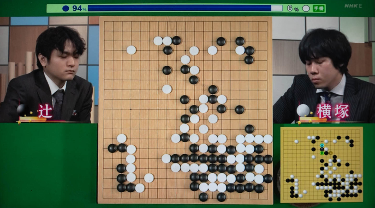 本日のNHK杯戦囲碁は黒番が辻󠄀篤仁5段、白番が横塚力7段の対戦です。この碁は本当にスリリングな展開でした。右下隅~下辺~中央で戦いが起き、中央が劫になったのですが、この結果黒は下辺の白6子を取込かつ下辺の白地を消したため、白が中央がやや厚くなったとはいえ、黒のリードになりました。白はそれでも左上隅方面から地模様を拡げようとしましたが、黒はここも的確に打ってリードを維持しました。白が勝負手で右上隅方面に入っていく手を打ち、また劫になりました。この勝負手が成功し、白は上辺での渡りが断たれたものの、右辺に進出出来、ここで眼を持って原形からすると白が大成功した形になりました。しかしそれでもまだ黒が良かったのですが、最後黒が左辺で頑張り過ぎ、中央の黒石を切断されて眼がなくなり、中央の黒の大石が頓死して白の大逆転勝利となりました。横塚力7段の最後まで諦めない粘りが勝利につながりました。