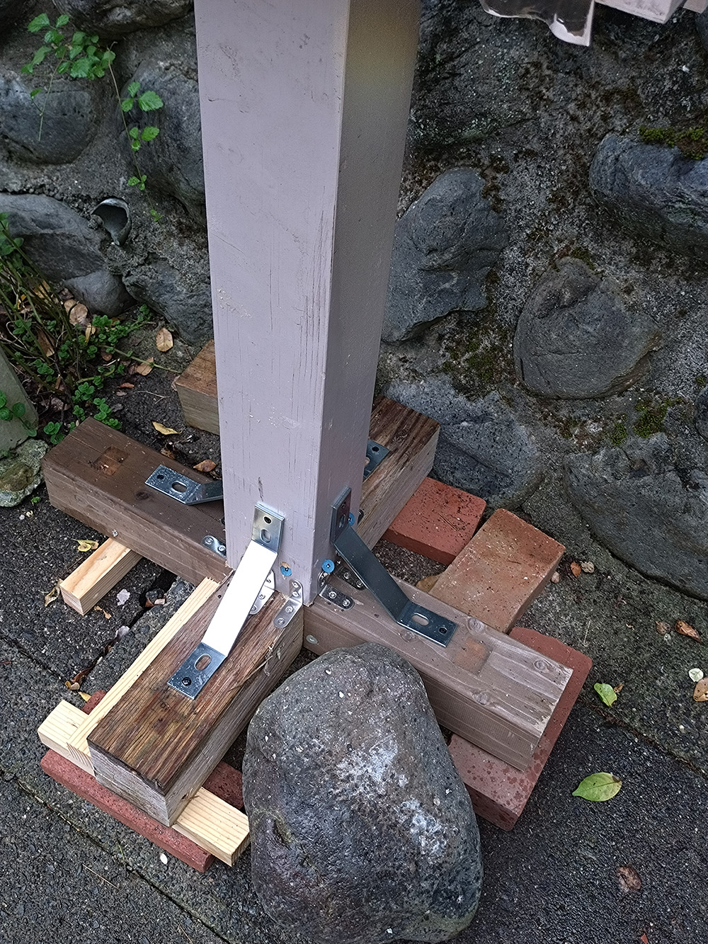私の自宅周りでの新聞配達は各家の玄関ないし郵便ポストまで配達してくれなくて、5~6軒が集まったエリアに入る入り口に写真のような新聞受けがあってここに配達されます。この新聞受けが土台部と本体部が分離していて、壁に立てかけてあったような状態だったのですが、台風等が来た場合に危険と思って、私はL字金具を3X4の12個使って土台と本体を接合しました。その後近所の人が強度に不安を感じたのか、斜めに釘を打っているのですが、これが方向的にほとんど補強になっていないと思ったので、ご覧のような斜めの補強板を四方に追加しました。これで台風が来ても外れることはない筈です。