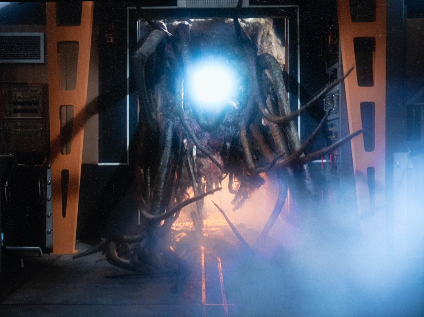 スペース1999の”Dragon’s Domain”を観ました。このエピソードはなかなか秀作でした。というかコーニック司令官、バーグマン教授共に、巨額をかけた宇宙計画で失敗して、ムーンベースαにはいわば左遷されて来たという過去が暴露された回でした。チェリーニという元宇宙飛行士で今αにいるものが、悪夢を見て、5年前にウルトラという星を探査する時に遭遇した敵の接近を感知し、イーグルを奪って単身それに向かおうとしますが、コーニック司令官に阻止されます。チェリーニはそのプロジェクトで目的の地球型の星の軌道上にまるで宇宙船の駐車場のように6隻くらいの最新の宇宙船が放置されているのを目撃し、その一つにドッキングし調査しようとします。しかしそこで写真のような怪物に襲われ、他のクルーは全員食べられ、彼だけが必死に逃亡して地球に帰還します。しかしレコーダー類には何も記録されていなかったため、彼は頭がおかしくなったと判断され、彼を弁護するコーニック、バーグマン教授共々まとめてムーンベースα送りになります。(笑)そして今度はムーンベースαに以前チェリーニが見た宇宙船の駐車場みたいなのが現れます。チェリーニはカーターを殴り倒して単身それに向い、斧やナイフで対抗しますが、コーニックらが追いついた時には血彼尽きて食べられてしまいました。コーニックは怪物の眼をナイフで刺して何とか倒します。タイトルはDragonなんですが、どっちかというとクモで、要するに宇宙船の駐車場は蜘蛛の巣みたいなものです。