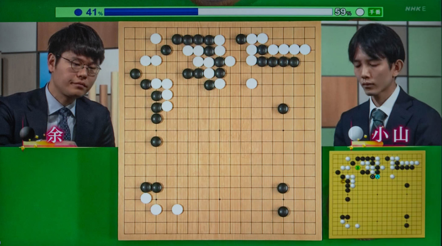 本日のNHK杯戦囲碁は黒番が余正麒NHK杯選手権者、白番が小山空也7段の対戦でした。碁は戦いに次ぐ戦いでしたが、特に黒が白の上辺の構えに2線に打ち込んでからの戦いが難解でしたが、結局黒が白の左上隅を取り込み、白が中央を制するという大きな振り替わりになりました。これは元の形からして黒が少しやったように思います。しかし白は中央の厚みを生かして右辺に打ち込み、右辺上方の黒に寄りついていこうとしました。その後の戦いも難解でしたが、白が黒の急所に中央から覗いていったのがやや打ち過ぎではないかという感じで、その後その覗いた白を逃げ出した一団がある意味お荷物になりました。その中央の白が黒1子をシチョウに抱えて、白が左下隅をハネたタイミングで、黒が白の左下隅の開きに覗いたのがシチョウアタリになっていて、白は色々抵抗しましたが、最後はシチョウの逃げ出しを防げば白の左下隅が死ぬというカラミになり、白の投了となりました。