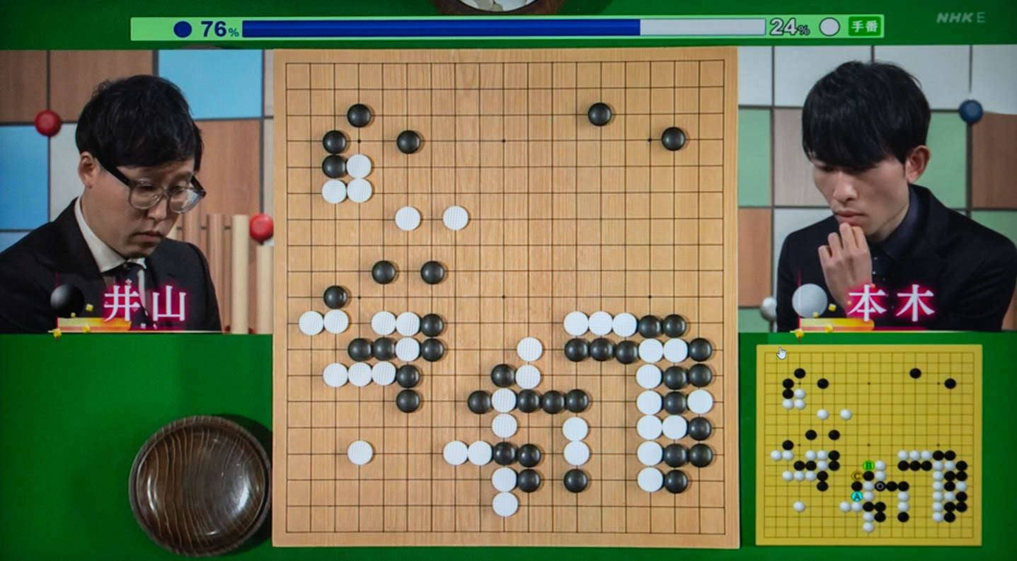 本日のNHK杯戦囲碁は黒番が井山裕太碁聖、白番が本木克弥9段の対戦です。この碁の最大の焦点は右下隅の戦いで、双方が眼の無い攻め合いの形になりましたが、白からはあまり締め付けが利かない形で、一方黒の右下隅の地は50目レベルになりました。白としてそうなると左辺の黒を全部取るしかなくなり、猛然と攻めましたが、左辺の上方の白もあまり強くなく、結局黒が中央に出て白の包囲網を突破し右辺とつながりました。そうなると白は上辺での攻め合いを目指しましたが、結局手数が足らず、白の投了となりました。