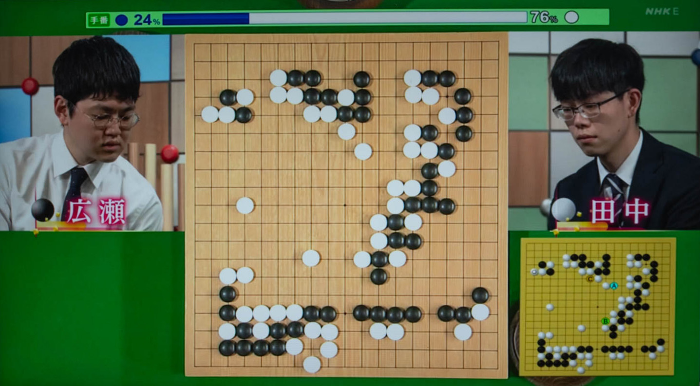 本日のNHK杯戦囲碁は、黒番が広瀬優一7段、白番が田中康湧5段の対戦でした。この碁は右辺の黒模様、左辺の白模様の対抗になりました。しかし白模様の方が大きく、黒がその中に手を付けて行きましたが、左上隅でのツケ切りがいま一つ上手くいかず、結局白は黒の7子くらいを飲み込み、黒は多少下の方から白模様を侵食しましたが、この別れは白が有利で優勢になりました。その後黒もヨセで色々挽回を図りましたが若干得をした程度で、結局終わってみれば白の7目半勝ちという大差となりました。