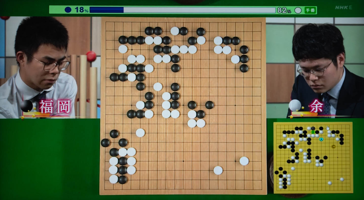 本日のNHK杯戦囲碁は黒番が福岡航太朗7段、白番が余正麒NHK選手権者の対戦です。勝った方が井山裕太碁聖との決勝に進出します。碁は開始早々で白が左上隅方面の黒模様に入っていった段階から激しくなりました。福岡7段が厳しい手を打ち続けましたが、余NHK選手権者が上手く打ち回して中央押さえに回り、上手く捌きました。そして今度は中央の黒と右上隅方面の白の競い合いになりましたが、ここも白が上手く捌いた感じです。こうなると白の下辺の模様が大きく、ここがどれだけまとまるかの勝負になりました。黒は大ゲイマジマリに付けて行って侵入を図りましたが、結局は劫になりながら白が黒6子を取り込み、白の下辺の大きな地が確定しました。それでも黒は更に別の劫に持ち込み、白の左辺上方から伸びる大石の切り離しと取り込みを狙いましたがこれも不発でした。最後非常手段で黒は更に右辺で白の大石を狙った劫に持ち込みましたが、結局この劫に負けた黒は右辺の地に侵入されただけではなく、黒の大石の眼が逆になくなり取られてしまい、黒の投了となりました。決勝の組み合わせは昨年と同じになりました。